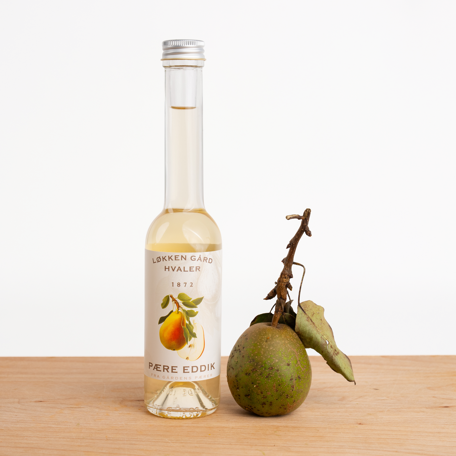 Vår egen eddik laget fra gårdens solmodne pærer. Prøv i vinaigretter og marinader! Gir en nydelig dybde til kjøtt, fisk og grønnsaker.