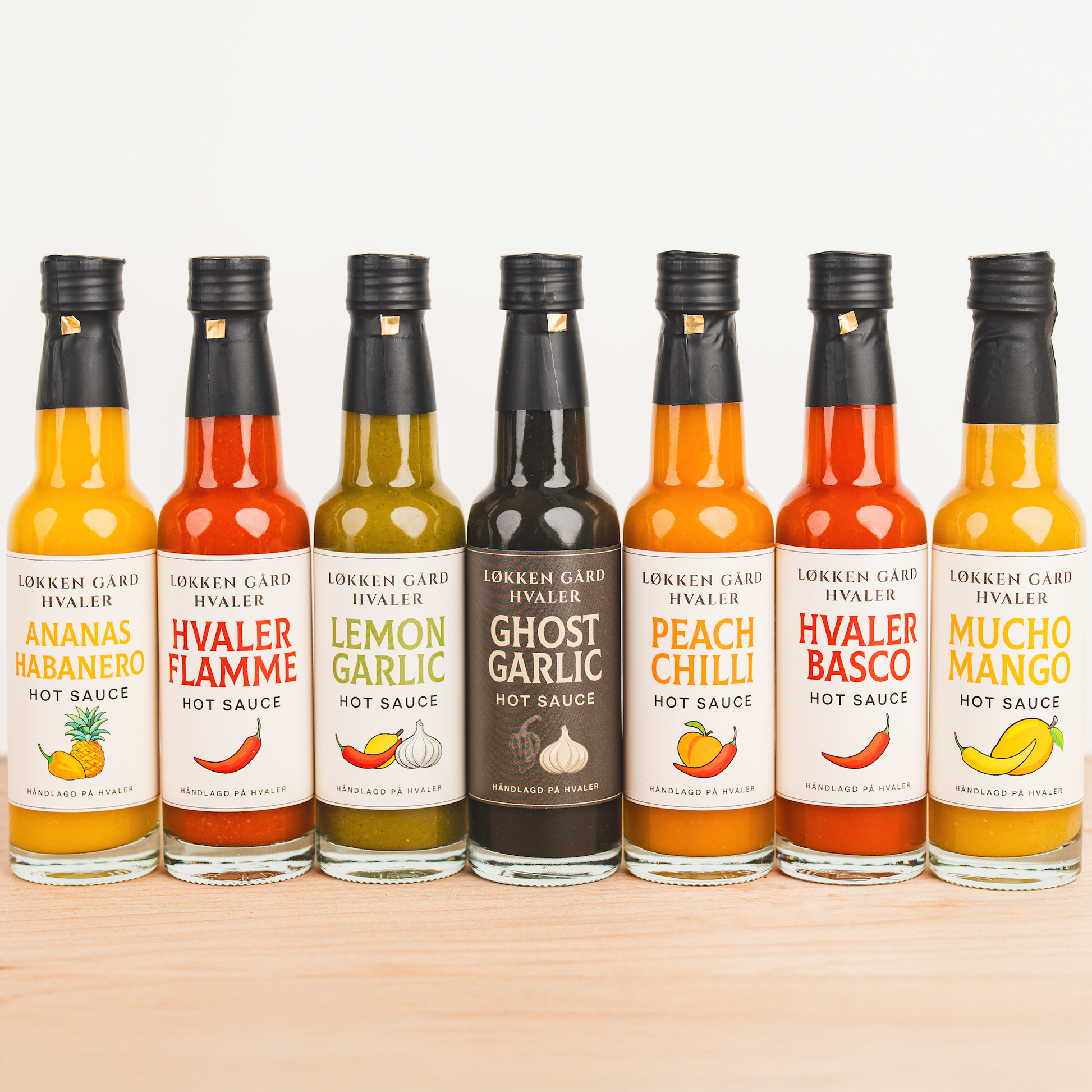 I pakken har vi alt fra mild til sterk, så du kan smake deg gjennom hele spekteret. Perfekt for gaver, grilling, middager — eller for deg som vil finne din nye favoritt. Laget i små batcher, med ekte råvarer og masse smak.
